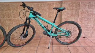 Se vende bicicleta de montaña Megamo Ku4. Bicicleta de montaña Megamo KU4 con ruedas de 24 pulgadas. Las bicicletas de este tamaño tienen frenos mecánicos que van muy duros y los niños no tienen tanta fuerza para accionarlos. Por este motivo fueron sustituidos por frenos de discos hidráulicos, más potentes y suaves. Las bicis están nuevas, no tienen ni un rasguño. Prácticamente no se han usado. - Ruedas de 24 pulgadas. - Color verde menta y negro. - Diseño deportivo.