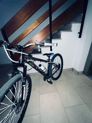 Bicicleta de montaña Mondraker. Costó 600€ nueva, sin contar algunos componentes que añadí después. - Cuadro de aluminio. Talla M. - Suspensión delantera RST. - Manetas de cambio a ajustar o cambiar, solo las manetas, desviador y casette funcionan bien. Shimano deore. - Cámaras a sustituir. Mucho tiempo sin uso. Regalo las 4 cubiertas que tengo. Hutchinson, Nokian. - Bielas Race Face y eje sustituidos por capricho y con muy poco uso. - Sillín fizik muy cómodo. Le falta un embellecedor lateral. - Manillar doble altura Tioga.