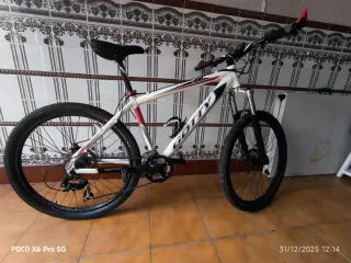 Bicicleta de montaña de la marca BH, con un diseño llamativo en rojo y blanco. La bicicleta está bien,pero habría que engrasarla y revisar los discos,ya que algún diente no está bien,es una bicicleta que por el precio que está es perfecta para arreglar un poco y tener una gran bici muy asequible. - Cuadro de aluminio. - Ruedas de 26 pulgadas. - Suspensión delantera. - Frenos de disco. Las ruedas están bien pero hay que hincharlas.