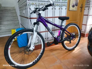 Bicicleta de montaña CONOR en color morado y blanco en perfecto estado. Ideal chicas por la posibilidad de bajar el asiento bastante. - Cuadro de aluminio. - Ruedas de 26 pulgadas. - Frenos de disco hidráulico. - Suspensión delantera XCM SUNTOUR. - luz delantera de batería. - Apoyos en manillar.
