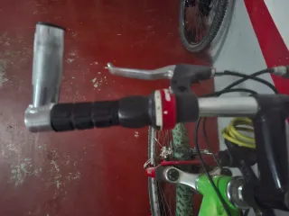 Bicicleta de montaña con manillar rojo y sillín negro, la bicicleta tiene un problema en la cadena, hay que cambiarla - Ruedas todoterreno. - Frenos de mano. - Diseño deportivo.