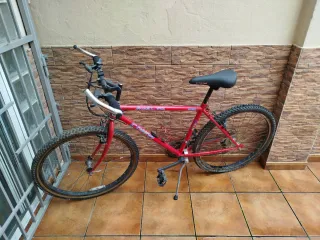 Bicicleta de montaña de color granate. Ideal para iniciarse en el ciclismo. - Cuadro de aluminio. - Ruedas de 26 pulgadas. - Frenos V-brake. - Cambio Shimano de 7 velocidades Ah falta de mantenimiento se vende por no usarla escucho ofertas. NO HA PASADO LA DANA POR MUCHO QUE SE VEA BARRO