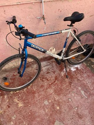 Bicicleta de montaña Decathlon modelo ROCHRIDER. - Cuadro de color azul y blanco. - Ruedas todoterreno. - Sillín negro. - Incluye timbre azul en el manillar.