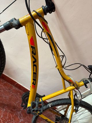 Bicicleta de montaña de color amarillo con detalles en rojo y negro. El cuadro tiene el nombre 'RACER' serigrafiado. - Cuadro de bicicleta. - Ruedas de bicicleta. - Pedales de bicicleta.