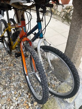 Bicicleta de montaña con amortiguador delantero. Ideal para terrenos irregulares. - Cuadro de color naranja y azul. - Ruedas de 20 pulgadas - Frenos de disco. - Cambio Shimano.