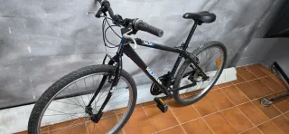 Bicicleta de montaña Btwin en color negro. Ideal para disfrutar de rutas y senderos. - Cuadro de aluminio. - Suspensión delantera. - Frenos de disco. - Ruedas de 27’5 pulgadas. La rueda de atrás está recién puesta y ambos frenos tambien. Tiene unos golpes en la parte delantera pero son bastante pequeños y el sillin tiene una leve rotura pero funciona perfectamente. Ver en la foto. Si vives por Vigo o alrededores puedo llevártela a casa.