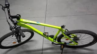 Bicicleta de montaña en color verde brillante. Ideal para disfrutar de rutas y senderos. -Transmisión monoplato -Manillar de carbono - Cuadro de aluminio. - Ruedas de 27.5 pulgadas. - Frenos de disco. - Suspensión delantera. Solo venta en persona, NO ENVÍO