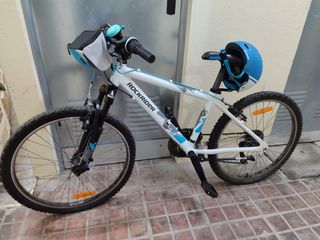 Bicicletade montaña infantil Rockrider 6-9 años, en color blanco y azul, ideal para los más pequeños. Incluye casco y cesta. Muy poco uso. - cuadro de aluminio blanco y turquesa. - Cambio Shimano - Ruedas de 20 pulgadas. - Frenos V brake - Timbre azul. - Cesta delantera. - Pata