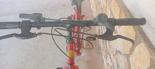 Bicicleta de montaña de color rojo, ideal para terrenos difíciles. - Cuadro de aluminio. - Suspensión delantera y trasera. - Frenos de disco.la entrego engrasada y limpia tiene polvo de estar guardada, esta nueva la e gastado dos veces no a hecho ni Descenso ni nada.fue un capricho.cambiaria por moto que me interesará como honda ns1 80,cross de dos tipos,alguna scoter 125cc 2t.se escuchan ofertas