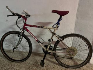 Bicicleta de montaña de color azul con suspensión delantera y trasera. Falta sillín Funcionan perfectamente las marchas. - Una rueda pinchada - Cuadro de aluminio. - Ruedas de 26 pulgadas. - Frenos de disco delanteros y traseros. - Cambio Shimano de 21 velocidades