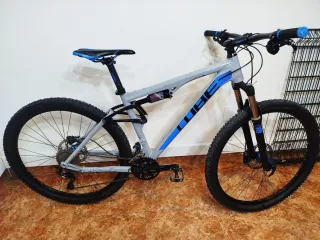 Bicicleta de montaña Cube con un diseño moderno en gris y detalles en azul. - Cuadro de aluminio. - Suspensión delantera y trasera. - Frenos de disco. - Ruedas de 29 pulgadas. -Llanta de repuesto nueva