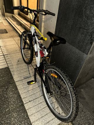Bicicleta de montaña Decathlon de 24 pulgadas. - Cuadro blanco y negro con detalles en amarillo. - Suspensión delantera y trasera. - Ruedas con reflectantes.