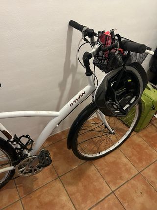 Bicicleta Btwin de adulto en color blanco. Incluye cesta delantera y guardabarros, casco nuevo, bidón de agua, luz e inflador portátil. Ideal para paseos y desplazamientos urbanos. - Cuadro de aluminio. - Cambio Shimano, 7 velocidades y 3 platos. - Sillín gel.