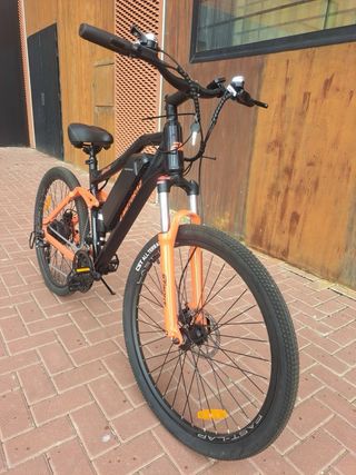 Bicicleta eléctrica Emotorad EMX en color negro y naranja. Ideal para disfrutar de tus paseos. - Cuadro de aluminio - Suspensión delantera y trasera -Suspension delantera de muelle - Batería extraíble - Frenos de disco -7 velocidades -3 platos -Cambio Shimano Altus -Ruedas de 27,5 -Bateria de 36 V, 13 AH (468 W) -Motor 250 W -Sillin de paseo Completamente nuevo, bicicleta de exposicion.