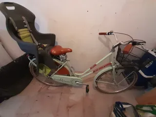 Bicicleta de paseo estilo holandés, ideal para desplazamientos urbanos y paseos. - Cuadro de paseo con diseño clásico. - Sistema de marchas integrado. - Sillín cómodo para trayectos largos. - Cesta delantera para llevar objetos. - Portabebés trasero para transportar a un niño (opcional) sin portabebes 90€ Tambien lleva timbre Falta hinchar ruedas, por no usarla