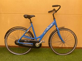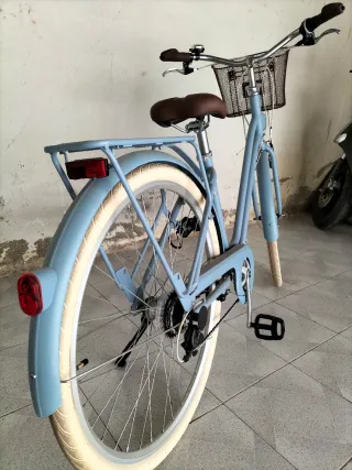 Bicicleta de paseo estilo holandés en color azul, perfecta para disfrutar de paseos tranquilos. Impecable. Muy poco utilizada. - Cesta delantera de mimbre. - Sillín marrón. - Ruedas con banda marrón. - Cambio shimano 6 marchas. - Foco delantero y trasero.