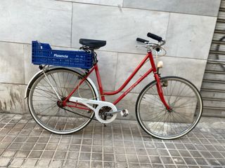 Bicicleta Orbea clásica de paseo en color rojo. Ideal para disfrutar de paseos urbanos. - Cesta delantera azul. - Guardabarros blanco. - Sillín negro. funciona perfectamente