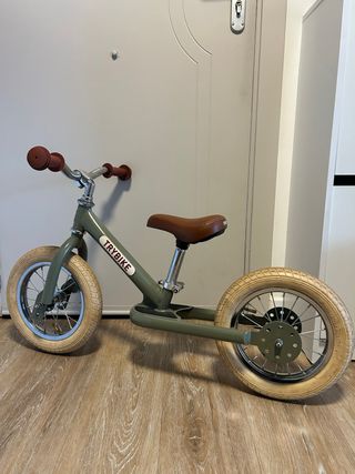 Bicicleta de equilibrio de la marca Trybike, ideal para los primeros paseos. - Color verde militar. - Asiento y puños marrones. - Ruedas de aire con llantas plateadas.