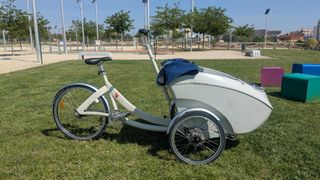 Bicicleta de la marca danesa Triobike para llevar hasta dos niños, muy ligera. El habitáculo tiene gran capacidad se puede cargar hasta 110 kg, frenos de disco, bloqueo de estacionamiento, cambio de buje interno Shimano de 7 velocidades, cuadro fabricado de aluminio. También lleva una capota resistente al agua y a los rayos UVA. Es ideal para llevar a niños pequeños al cole, de paseo, a actividades... Muy cómoda de manejar a los niños les encanta.