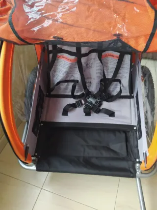 Carro de paseo para niños con arnés de seguridad. - Estructura metálica. - Asiento acolchado. - Capota protectora. - Ruedas para transporte.