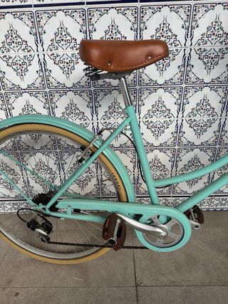 Bicicleta de paseo con un estilo vintage y en perfecto estado. - Color: Azul menta - Sillín y puños de cuero marrón - Cesta delantera de mimbre - Guardabarros delantero y trasero - Pata de cabra