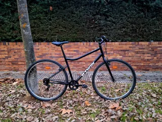 Bicicleta urbana-híbrida de Decathlon. En muy buen estado. Todo funciona correctamente y no tendrás que llevarla al taller tras comprarla. Bicicleta sencilla y sólida. Ideal para paseos y desplazamientos por ciudad, carril bici y pistas de grava y tierra en buen estado. Con postura cómoda, con la espalda no muy inclinada. - Talla M (166 - 178 cm de altura). - Transmisión monoplato y cambio de 6 marchas Sunrace. - Cassette Shimano. - Frenos V-brake. - Manillar regulable en altura. Se puede ver en persona en Badajoz capital. Entrega en mano.