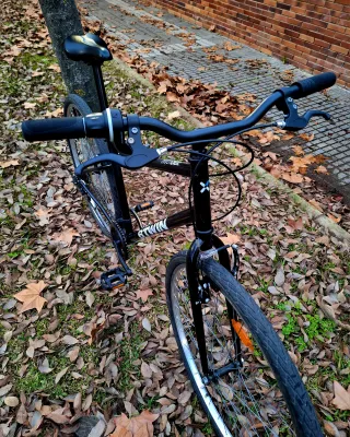 Bicicleta BMX Monty de color negro, ideal para trucos y paseos. - Cuadro de aluminio. - Ruedas de 20 pulgadas. - Frenos V-Brake. - Lleva otro sillín, más cómodo que el que venía. Se regala otra cubierta.