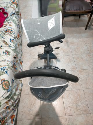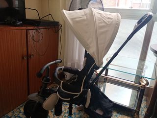 Triciclo versátil que sirve como andador y para paseo. - Estructura de metal. - Asiento con respaldo. - Ruedas de goma.