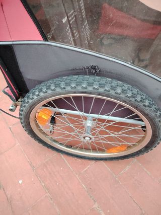 Carro de remolque para bicicletas, ideal para transportar niños. Su diseño permite acoplarlo a la bicicleta para paseos. - Color rojo y negro. - Ruedas de gran tamaño para mayor estabilidad. - Ventanas transparentes. Tiene un lateral un poco rozado y las ruedas un poco gastada el color también está un poco descolorido pero hace su función.