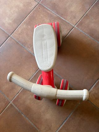 Triciclo de paseo para niños pequeños, con un diseño llamativo en rojo y blanco. - Asiento ergonómico. - Manillar con empuñaduras. - Ruedas con detalles a rayas.