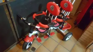 Recogida en mano en Castelldefels. Triciclo gemelar de la marca Giró, ideal para dos niños. Su diseño permite que ambos pequeños disfruten del paseo. - Asientos con capotas. - Cesta de almacenamiento. - Rueda delantera direcionable con el palo de arrastre. - Chassis de metal