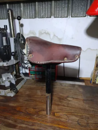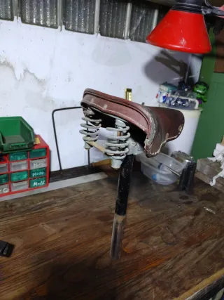Sillín de bicicleta antiguo con un diseño clásico y cómodo. - Material: Cuero marrón. - Sistema de muelles para amortiguación. - Base metálica. - Ideal para bicicletas clásicas o de paseo. ∅ del tubo 25mm