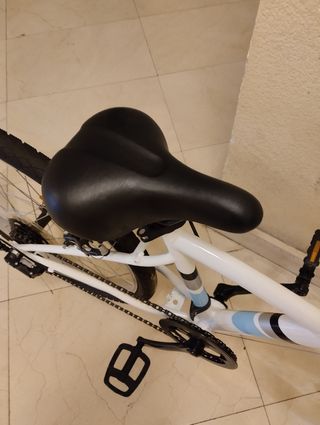 Bicicleta de montaña en buen estado. Ideal para paseos por ciudad o montaña. - Color blanco con detalles naranjas y azules. - Cuadro de aluminio ligero. - Sillín cómodo de color marrón claro. - Llantas en buen estado.