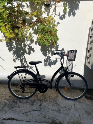 Bicicleta de paseo Decathlon en color negro. Ideal para desplazamientos urbanos y paseos. - Cuadro resistente. - Cesta delantera. - Portabultos trasero. *los posibles daños están señalados en las fotos. Son debido al paso del tiempo y con un poco de aceite y cuidado la bici funciona perfectamente