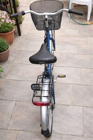 Bicicleta urbana de color azul, ideal para paseos y desplazamientos diarios. Cuenta con una cesta delantera y un práctico portabultos trasero. Muy poco uso y con ruedas nuevas sin usar. - Cesta de malla negra. - Portabultos trasero de metal. - Guardabarros delanteros y traseros. NO HAGO ENVÍO, recoger en persona