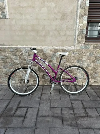 Bicicleta de montaña en color morado, ideal para paseos y rutas. - Cuadro de aluminio. - Ruedas de 26 pulgadas. - Frenos de disco. - Suspensión delantera.