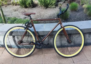 Bicicleta paseo fixie marrón ruedas amarillas