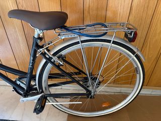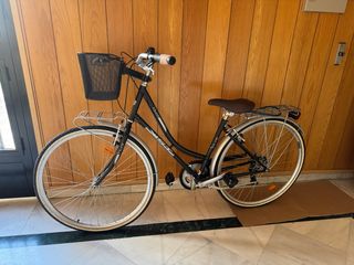 Bicicleta urbana de estilo clásico, ideal para paseos y desplazamientos diarios. Su diseño en color negro le da un toque elegante. - Cesta delantera negra. - Guardabarros plateados. - Portabultos trasero. - Es regalo de reyes que no se ha usado