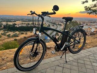 Bicicleta eléctrica LEGEND Firenze (trekking 26”) en muy buen estado, con batería cambiada y revisión completa realizada en septiembre 2025 por la tienda de bicis eléctricas donde la compré. Está lista para ser usada. Incluye CARGADOR original, CANDADO plegable y CASCO como nuevo. Es del 2013, muy cómoda para ciudad y paseos. Talla M-L. Pesa aprox. 24,5 kg, con luces LED, portaequipajes, guardabarros y batería tras tija (fácil de sustituir). En la web de LEGEND bicis reacondicionadas similares + de 1.200 €.