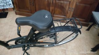 Bicicleta de paseo City6 con cesta delantera y portabultos trasero, luz trasera y delantera, y timbre. Comprada en Carrefour en octubre de 2023 y con muy poco uso. Que yo haya visto, solo tiene un defecto, que puede verse en la foto de la parte inferior del sillín, donde uno de los plásticos está roto. - Ruedas de 28 pulgadas. - Color oscuro. - Cesta de mimbre. - Sillín cómodo.