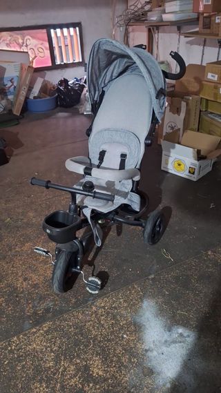 Triciclo Kinderkraft en color gris, ideal para paseos. Está sin usar. - Diseño moderno y funcional. - Capota para proteger del sol. - Barra de seguridad. - Cesta de almacenamiento.