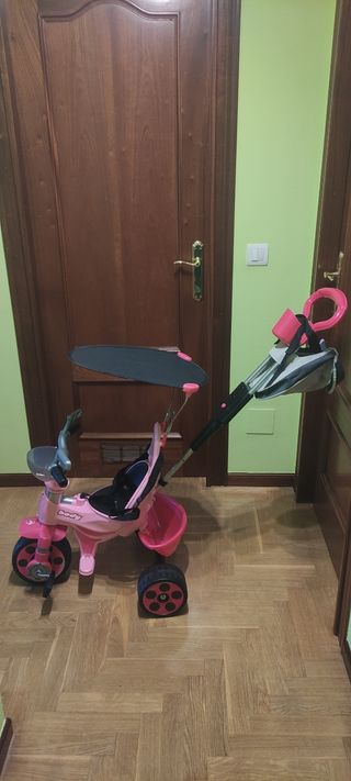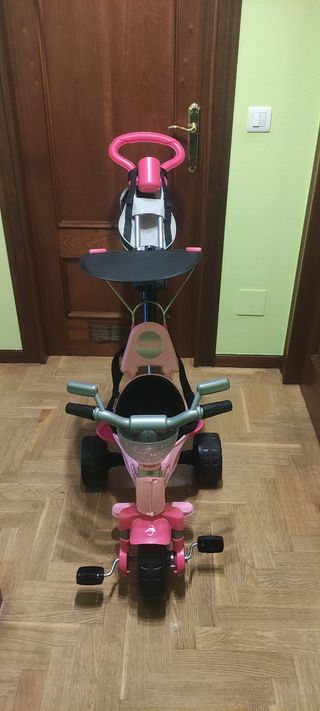 !!!!!OJO LOS PEDALES NO TRACCIONAN AL PEDALEAR!!!!!! Triciclo infantil de paseo en color rosa. Barra de empuje para padres extraíble. Capota parasol. Asiento seguro con arnés y barra de seguridad para que vaya bien sujeto. Cesta delantera y trasera Bolsa adicional y portabebidas Reposapiés y pedales.