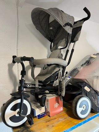 Triciclo Kinderkraft para paseo de bebés. Diseñado para la comodidad y seguridad. - Asiento acolchado. - Capota para el sol. - Barra de seguridad. - Reposapiés. - Ruedas resistentes. Tiene muy poco uso
