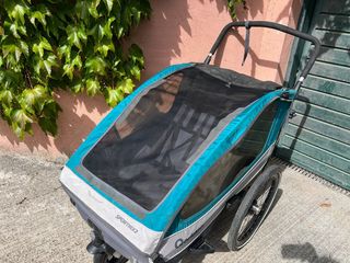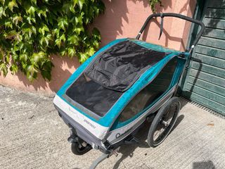 Carrito remolque para bicicleta marca Queridoo, modelo Sportrex 2. Es espacioso, pueden viajar 2 criaturas comodamente y detràs tiene un maletero. Diseño con 3 capotas distintas a elegir: malla para proteger de mosquitos o piedrecitas, plástico para la lluvia y el frio, una tela negra para proteder del sol. Ruedas de 16 pulgadas. El carrito puede usarse también de paseo al quitarse el enganxe que lo une a la bicicleta. Lo compramos nuevo hace unos 4 años, su precio es de 500€. Está en buen estado, lo hemos usado sobretodo para ir a la escuela.
