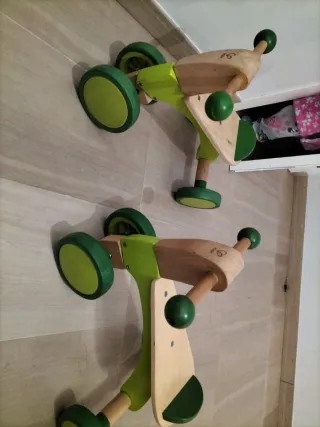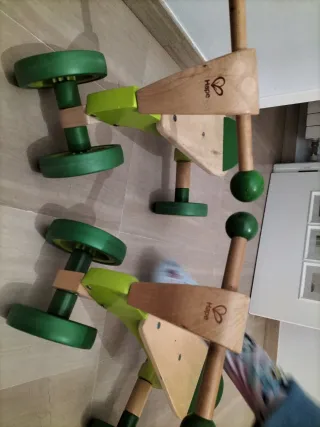 Triciclo de aprendizaje Hape, ideal para los primeros paseos. Fabricado en madera natural y detalles en verde. - Diseño ergonómico y seguro. - Ruedas de goma para un rodaje suave. - Asiento cómodo y manillar con puños de goma. 10€ CADA TRICICLO