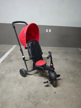Triciclo Smart Trike en color rojo, ideal para paseos. Genial porque va desfe pequeño. - Diseño moderno y funcional. - Capota para proteger del sol. - Asiento acolchado para mayor comodidad En perfecto estado y con todos sus accesorios. Usado mayormente en patio interior de la casa para aprender a pedalear