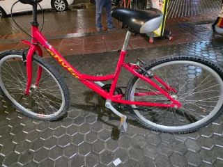 Se vende bicicleta de paseo para mujer/urbana en color rosa fucsia. Es una bici muy cómoda y práctica, ideal para moverse por la ciudad o ir a la compra. Características principales: Cuadro de acceso bajo: Muy fácil de subir y bajar. Almacenamiento: Incluye cesta delantera de rejilla y portaequipajes trasero reforzado. Comodidad: Sillín ergonómico antiprostatático y manillar alto para una posición de espalda recta. Accesorios: Guardabarros delantero y trasero, pata de cabra, timbre y reflectores.
