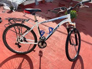 Bicicleta de montaña BH Over.X con cuadro blanco y detalles azules. Ideal para paseos y rutas. - Cuadro de aluminio. - Suspensión delantera. - Portabultos trasero. Le hace falta la cadena y los frenos