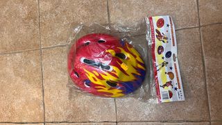 Casco de bicicleta infantil con un diseño llamativo de llamas rojas, amarillas y azules. Ideal para proteger durante paseos. - Diseño de llamas. - Colores: rojo, amarillo y azul. - Apto para ciclismo y patinaje.