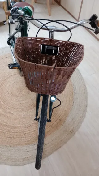 Bicicleta de paseo en color verde, con un diseño clásico y elegante. Perfecta para disfrutar de paseos tranquilos. - Cesta delantera de mimbre. - Sillín marrón. - Portaequipajes trasero. Recogida en domicilio. Precio definitivo.